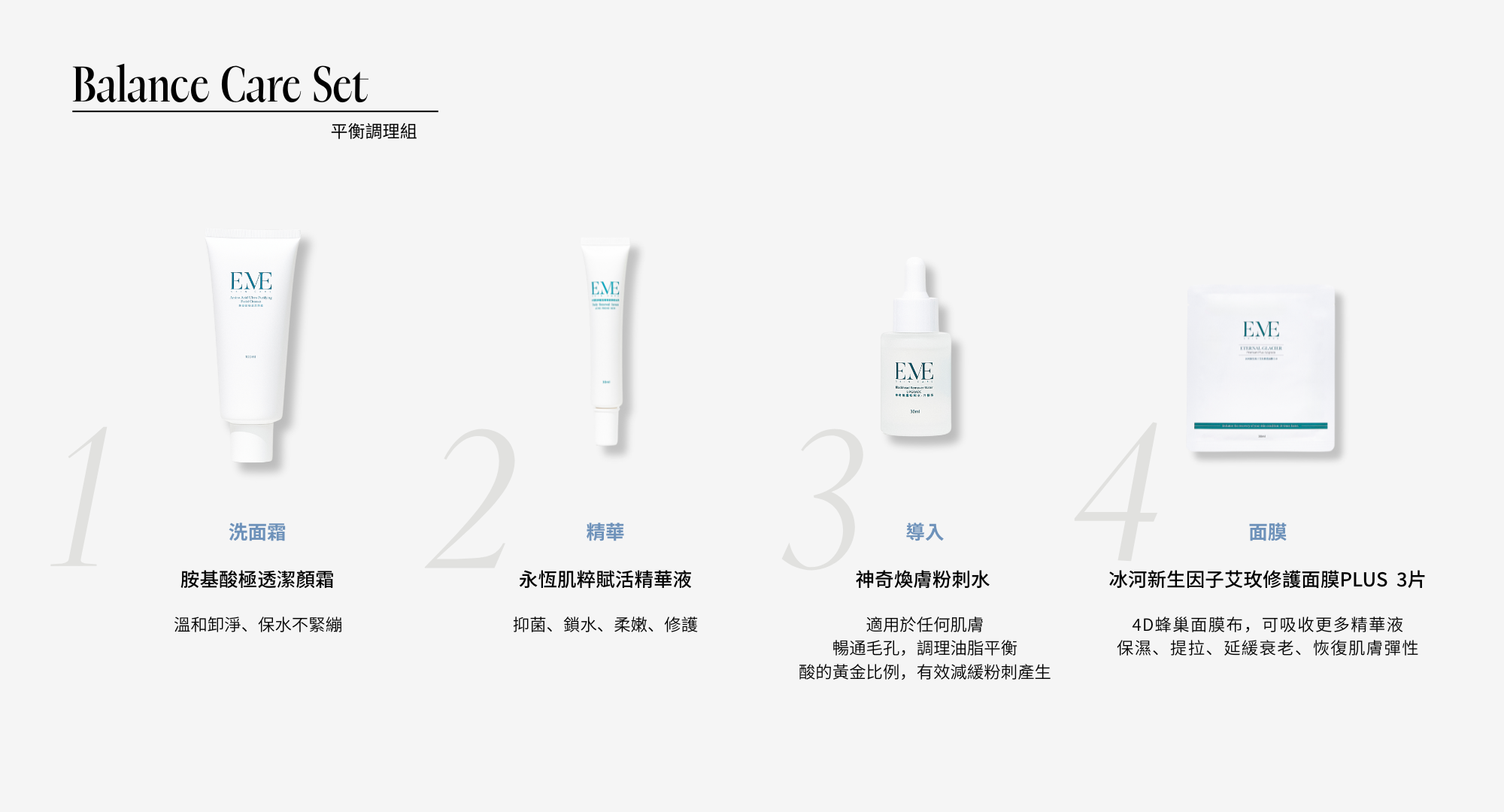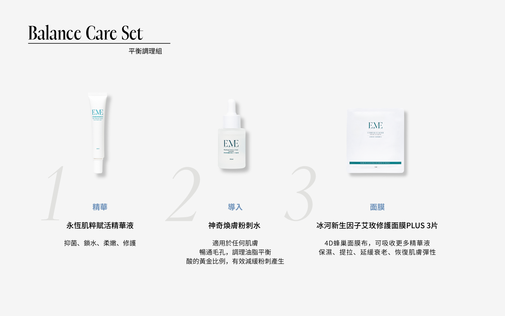 ‧ 永恆肌粹賦活精華液:全臉使用,平衡出油與修護痘肌