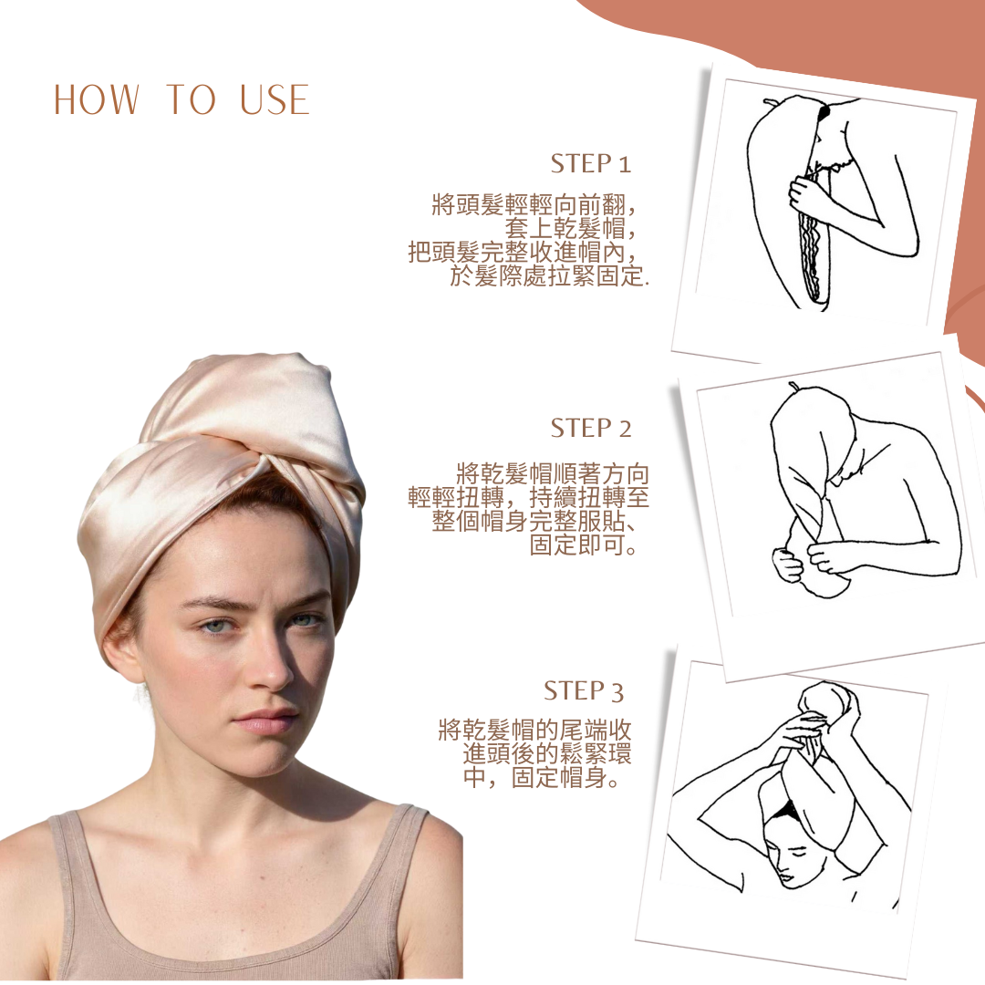 BEBE SILK 真絲乾髮帽專為洗後護理設計,結合真絲的柔滑觸感與加厚吸水層,能迅速吸乾水分,同時減少摩擦與靜電。洗完頭髮後輕輕包覆,即可自然速乾、不毛躁。讓妳的每一次洗髮,都像做完護髮一樣柔亮。